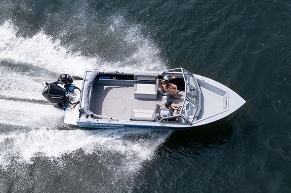 - Single piece hull sides with upswept bow and wide formed gunnels