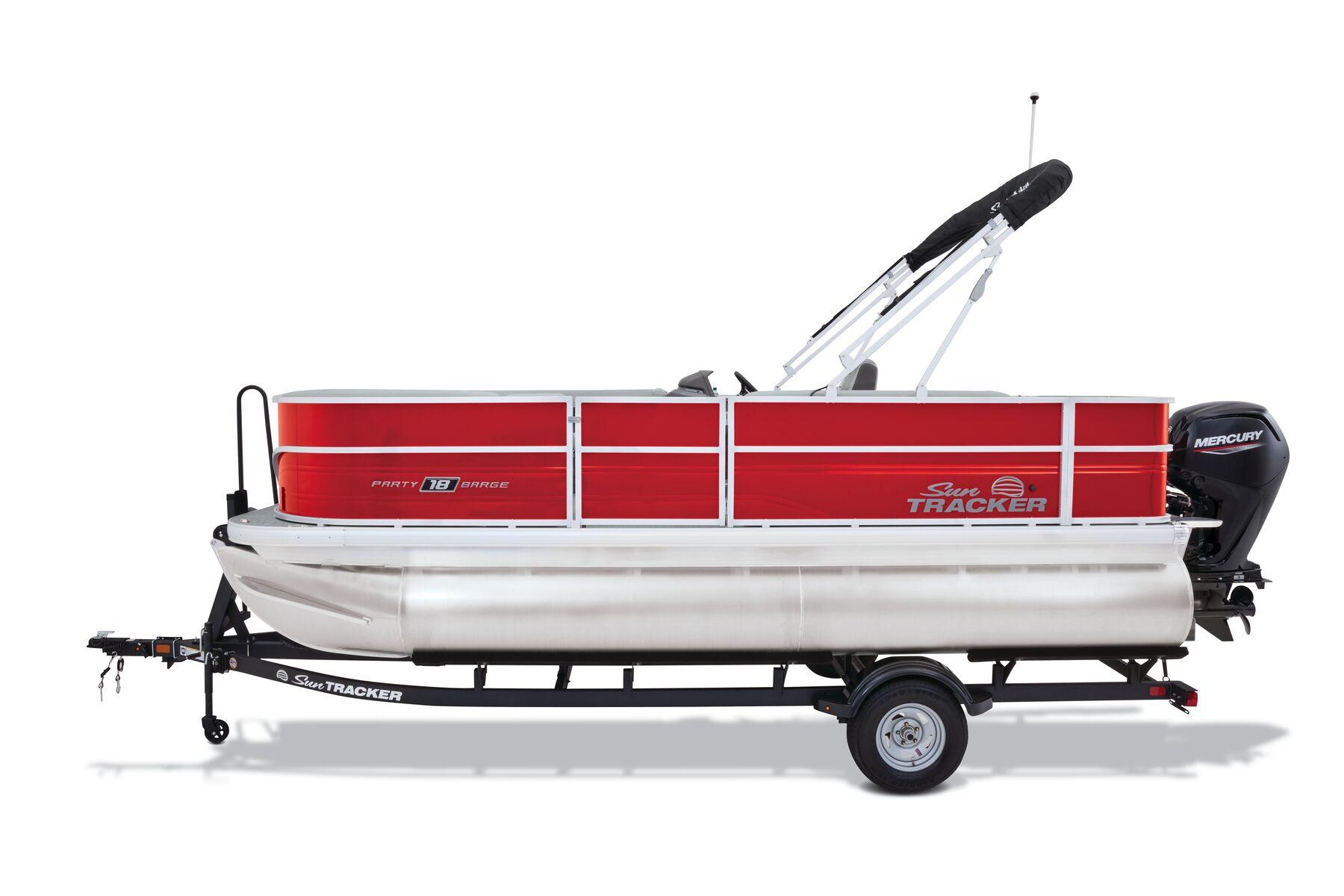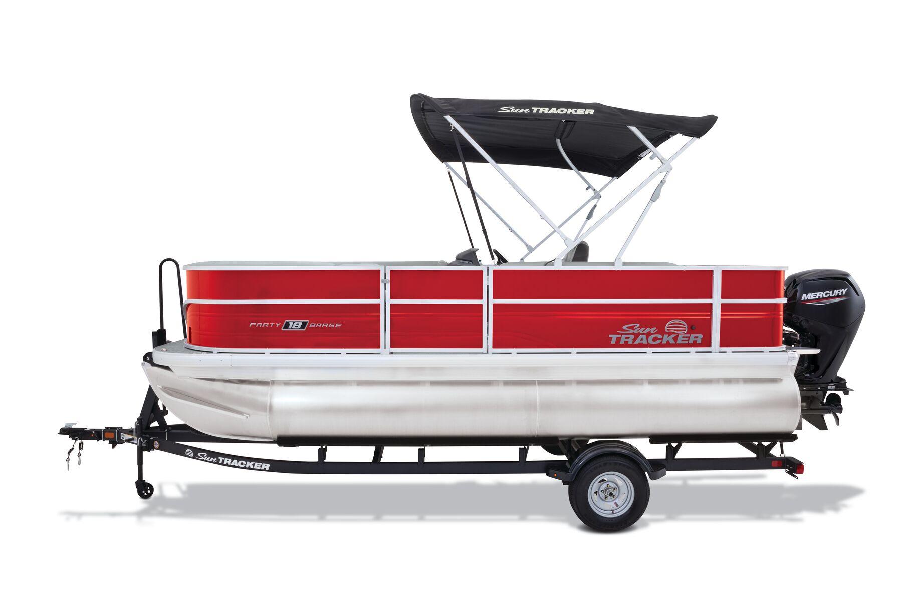 2026 Sun Tracker Party Barge 18 DLX pontoon with Mercury 60HP. All-new design, huge storage, bimini, new ladder & touchscreen helm. Financing & trades welcome.